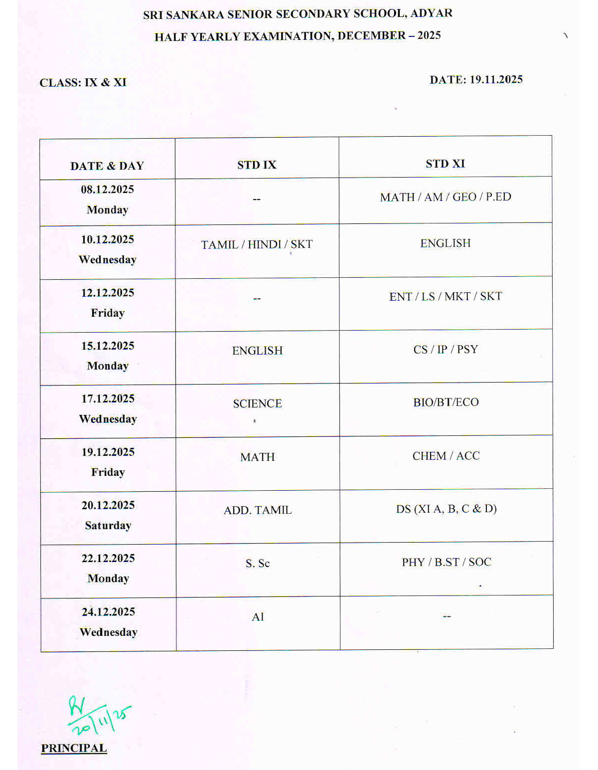 Half Yearly Examination – December 2025 (STD IX & XI)