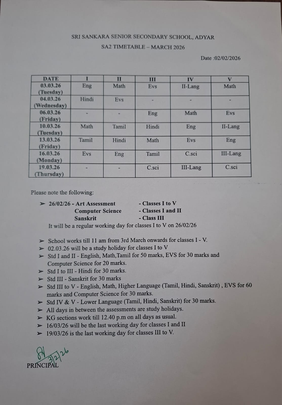 SA2 Time Table – March 2026 (Std I – IV)