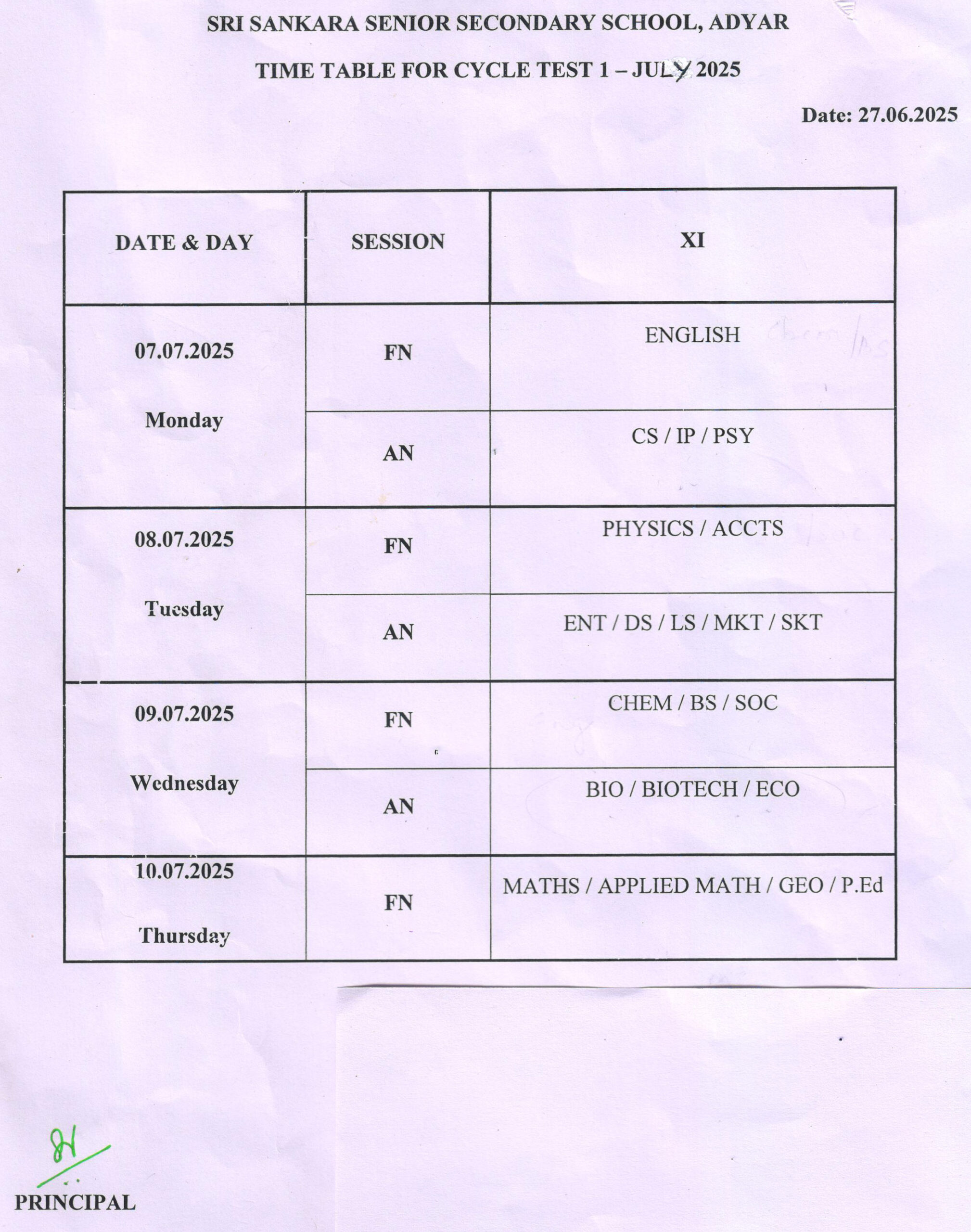 Time Table for Cycle Test 1 – July 2025 (XI)